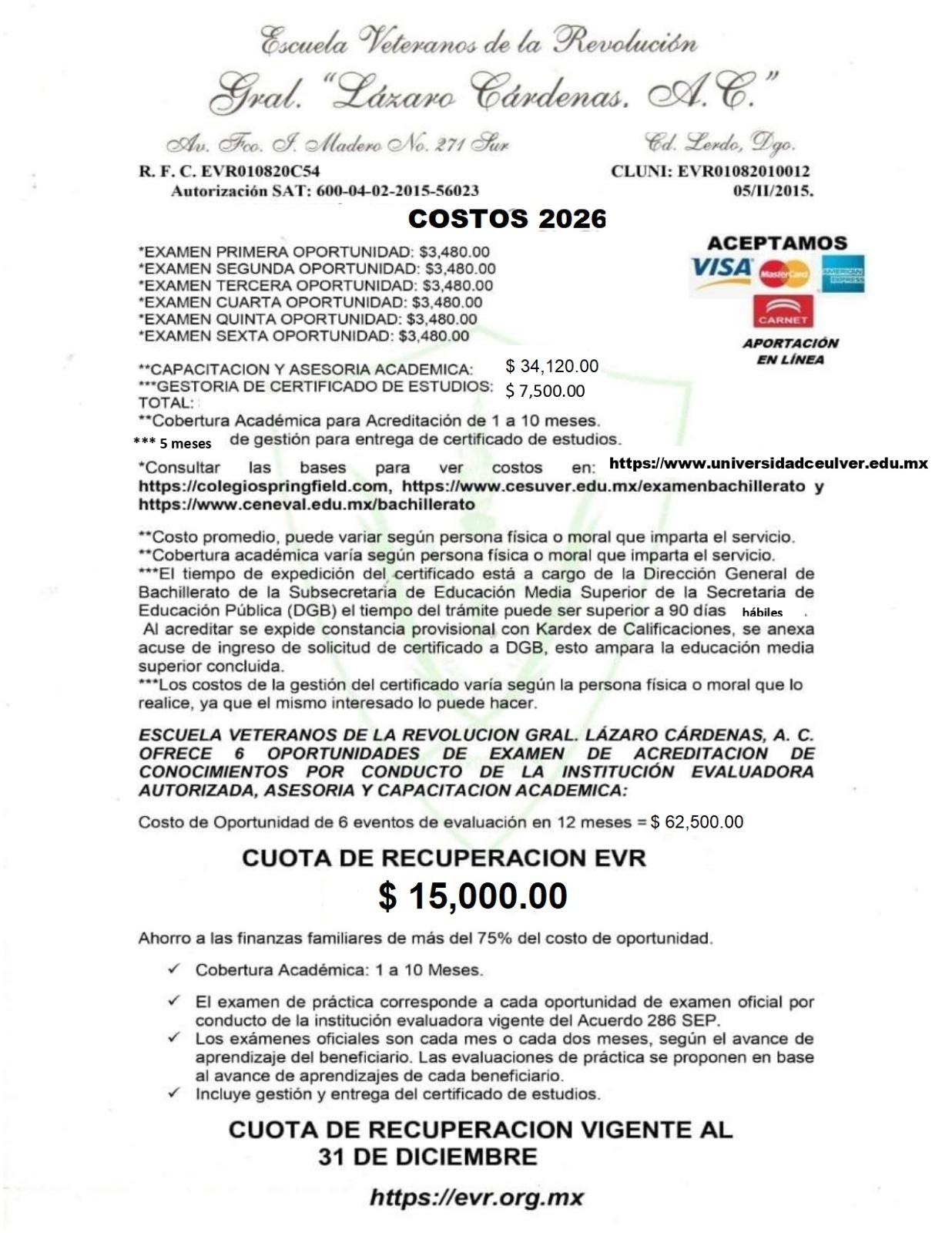 Con 6 oportunidades de Examen de acreditación de conocimientos en modalidades: Lápiz y Papel y por Intermediación Digital para el bachillerato general y 3 oportunidades de Examen Escrito y 3 oportunidades de Examen Oral para Licenciatura. A un sólo costo.